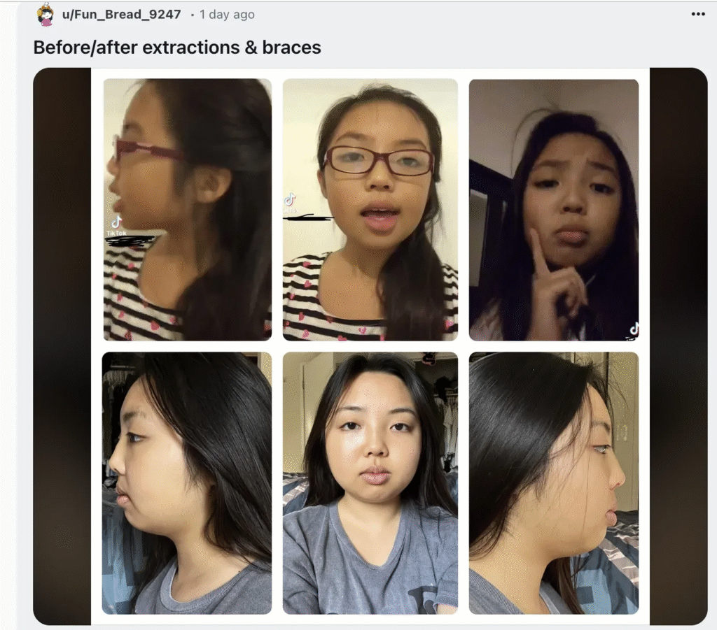 有時,這些病患出現的是明顯的症狀,例如劇烈的疼痛和頭痛……但更多時候,受到破壞的是他們的臉型。就像前陣子在 Reddit 論壇上有人貼出的一位女孩的例子——她因為牙齒矯正而容貌受損,那位女孩的臉看起來彷彿被「融化」了一樣。