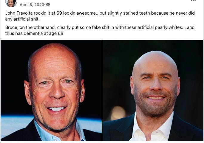 2023 年的某天,我得知了布魯斯·威利 (Bruce Willis) 罹患失智症的消息。起初我感到很震驚。隨即我快速在 Google 圖片搜尋了「Bruce Willis 2023 笑容」。看過那些照片之後,我反倒一點也不意外了。