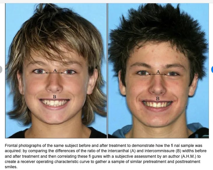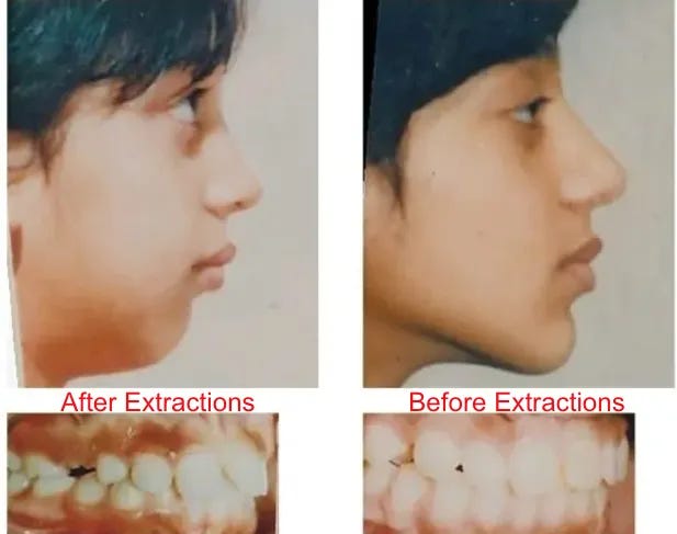 其中破壞性最大的一種做法,就是在矯正時同時拔掉四顆小臼齒——這雖然是很常見的矯正流程,但卻會從根本上改變人的面部結構。
