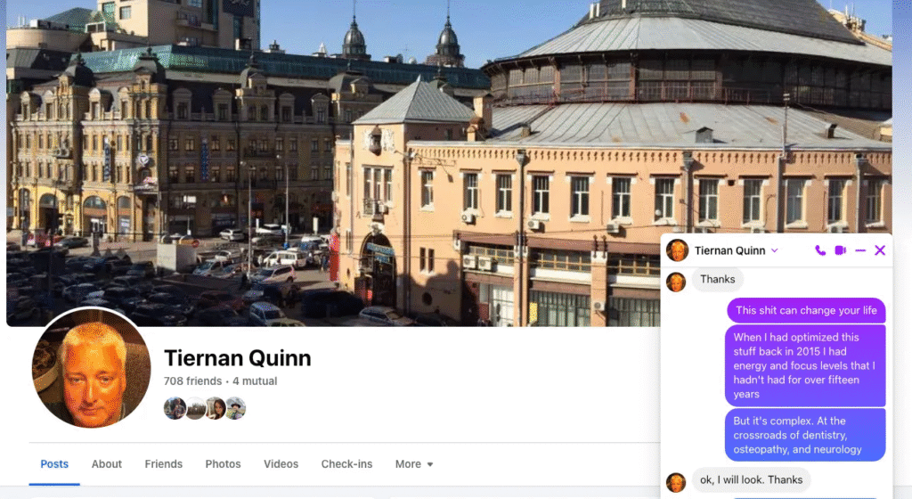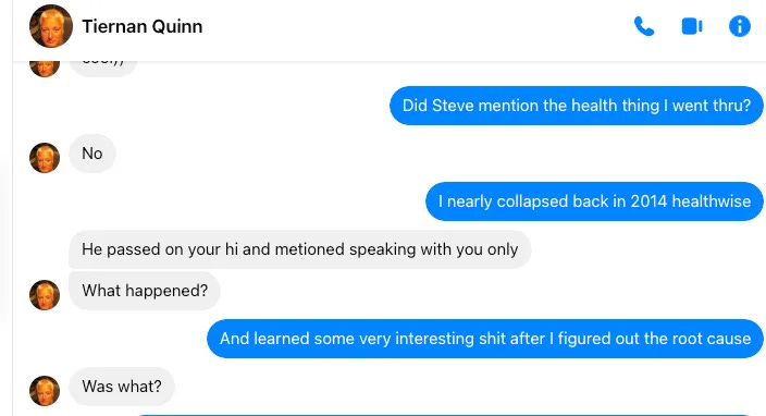 到了 2018 年,我對這套生物力學原理的研究已經相當深入,也覺得或許能用它來幫助 Tiernan。當我們共同的朋友 Steve 提到 Tiernan 的健康狀況始終不見好轉時,我透過臉書聯繫了他,向他分享了我自 2014 年以來一路走過的親身經歷——當時牙醫的一次鑽牙治療讓我陷入了一場健康危機。