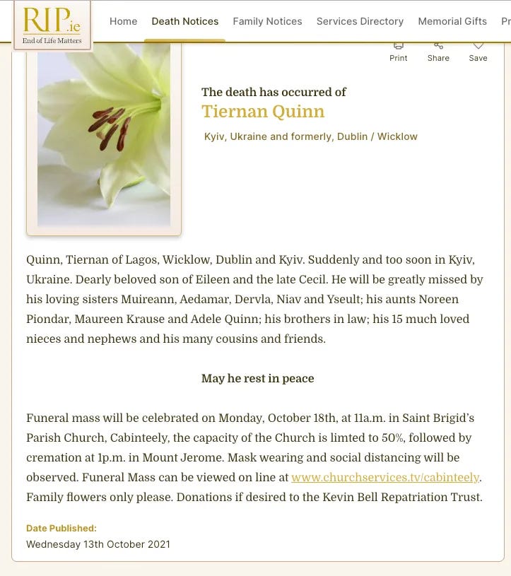在 Tiernan 過世後不久,我從一位共同朋友那裡得知了這個噩耗。聽到他在 2021 年 10 月離世的消息,我心裡既悲痛又不是滋味。