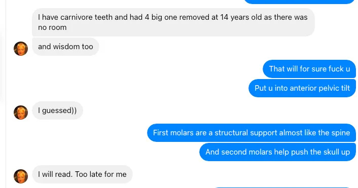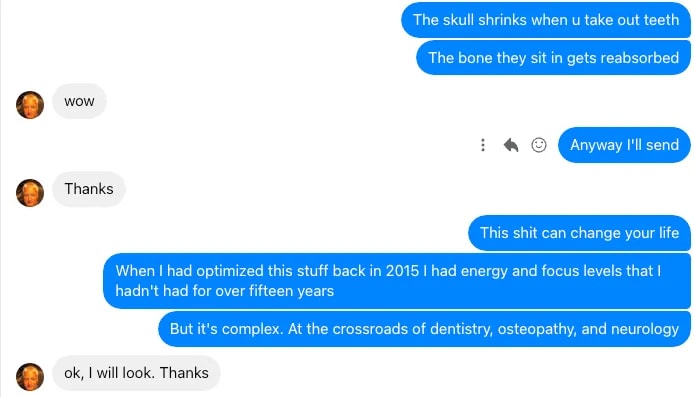 他的確被我說的內容引起了興趣,尤其是因為他拔掉過不少牙齒,所以我的理論多少讓他覺得有幾分道理(如上圖所示)。但他的語氣裡透著一種近乎認命的無奈……正如你在上面看到的,他回覆我:「對我來說已經太晚了。」